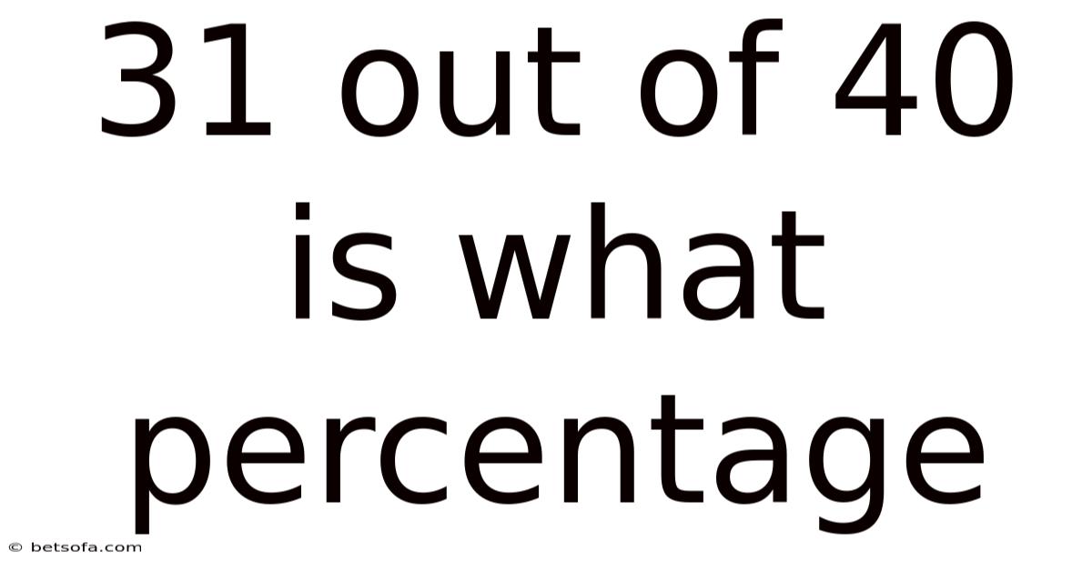 31 out of 40 equals 77.5%. This is calculated by dividing 31 by 40 to get 0.775, then multiplying by 100 to convert to a percentage.