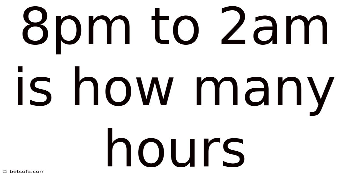 When you glance at a clock and see **8 p.m.Day to day, * Whether you’re planning a night shift, calculating travel time, or just trying to figure out how long you’ll be awake for a late‑night study session, understanding the exact duration between two times that cross midnight is a useful everyday skill. In this article we will break down the calculation step‑by‑step, explore why the answer is six hours, and look at the broader concepts of time‑interval arithmetic that make such problems easy to solve. m. **, the immediate question that pops into most people's heads is simple yet surprisingly common: *how many hours is that?to 2 a.By the end, you’ll not only know the answer—six hours—but also have a solid framework for handling any “overnight” time span you encounter.
