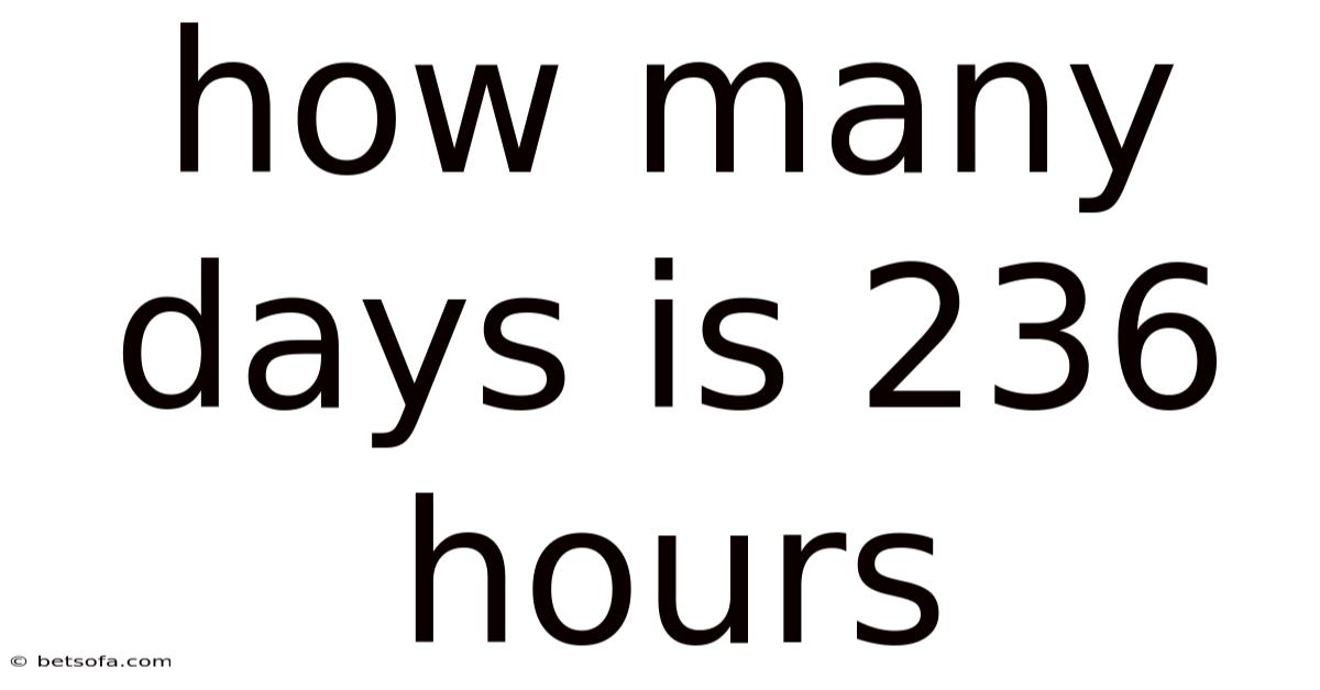 So, 236 hours equals 9 days and 20 hours. That said, this means that if you were to allocate 9 full days and then work an additional 20 hours, you would have a total of 9. 83 days.