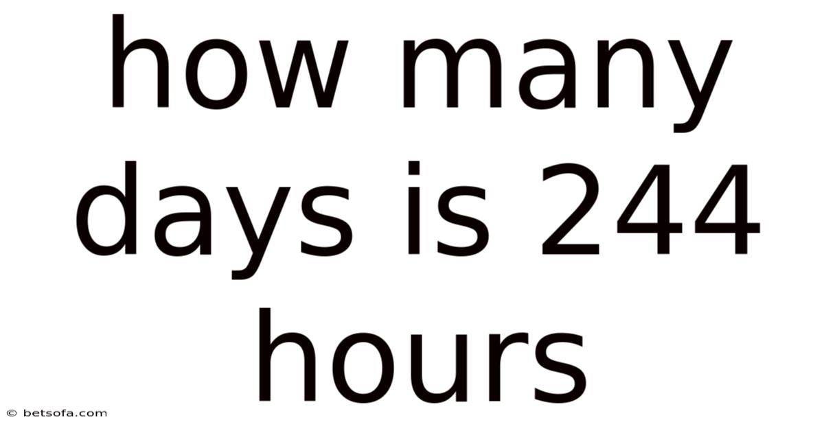 The mathematical calculation is straightforward: 244 hours ÷ 24 hours per day = 10.Because of that, this means that 244 hours is equivalent to 10 full days plus a remainder. In real terms, 1667 days. But 1667) by 24, which gives us approximately 4 hours. Practically speaking, to find the exact remainder, we multiply the decimal portion (0. Which means, 244 hours equals 10 days and 4 hours, or more precisely, 10 days, 4 hours, and 0 minutes (since the decimal is essentially zero at this point) It's one of those things that adds up..