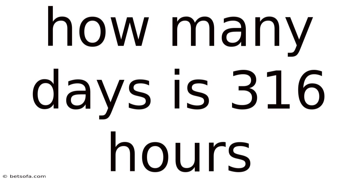 Time is a fundamental aspect of our lives, governing everything from our daily routines to long-term planning. Now, understanding how to convert between different units of time, such as hours and days, is an essential skill that helps us organize our activities, meet deadlines, and make sense of schedules. Consider this: this seemingly simple query requires a bit of calculation and context to answer fully. In practice, one common question that arises is: how many days is 316 hours? In real terms, at its core, this question involves converting a large number of hours into days, which is not as straightforward as dividing by 24 due to the presence of remainders that translate into partial days or hours. Now, in this article, we will explore the process of converting 316 hours into days, break it down step by step, provide real-world examples, and discuss why this skill is valuable in various contexts. By the end, you will have a clear understanding of the answer and the tools to tackle similar conversions on your own It's one of those things that adds up..
