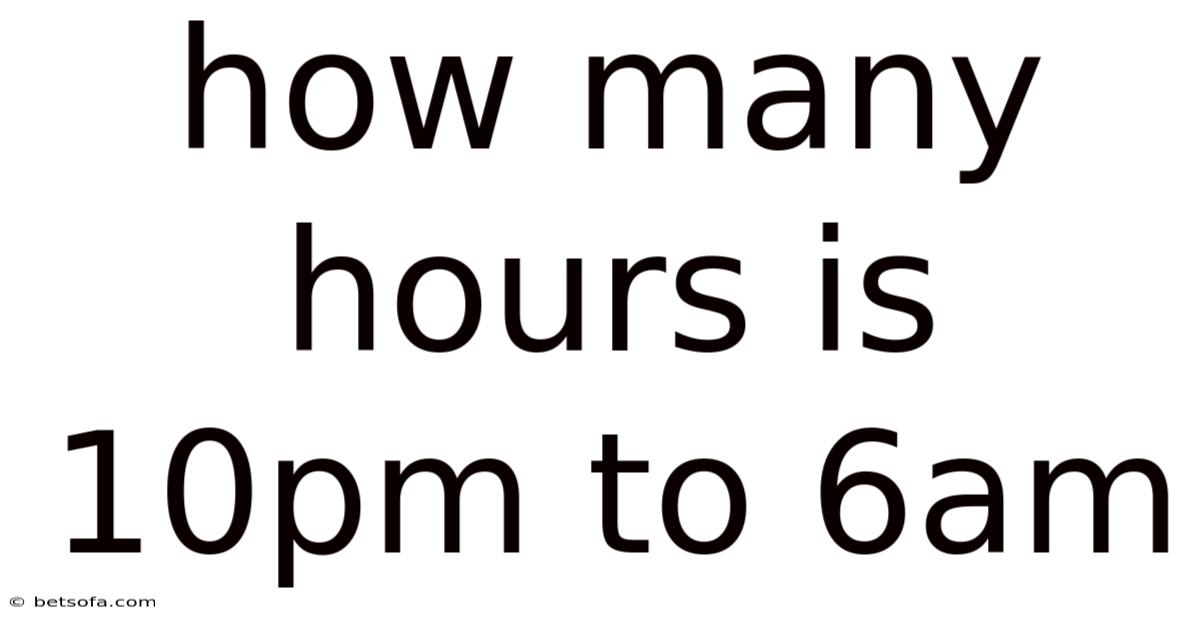 The phrase how many hours is 10pm to 6am asks for the total elapsed time when moving from the evening hour of 10 p.m. into the early morning hour of 6 a.m. The key point is that the clock resets at midnight, so the calculation isn’t a simple subtraction of 6 from 10. Instead, you split the interval into two parts: the time from 10 p.m. to midnight, and the time from midnight to 6 a.m. Adding those two pieces together yields the full duration That's the part that actually makes a difference..