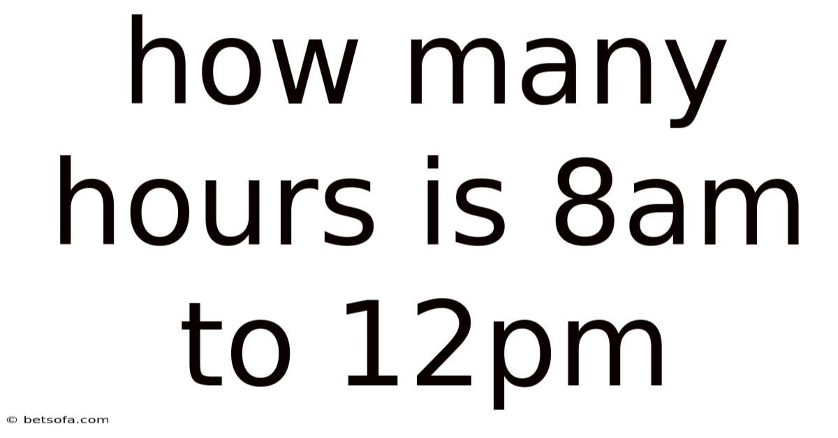 Understanding how many hours are in a given time range is a fundamental skill, especially in scheduling, planning, and time management. One common question that often arises is: how many hours is 8am to 12pm? At first glance, it seems straightforward, but without a clear understanding of time formats and counting methods, confusion can easily set in. This article will break down the calculation, explain the concept, and provide clarity on similar time-related questions. Whether you're scheduling a meeting, planning your workday, or just curious, this guide will ensure you never miscalculate time again.