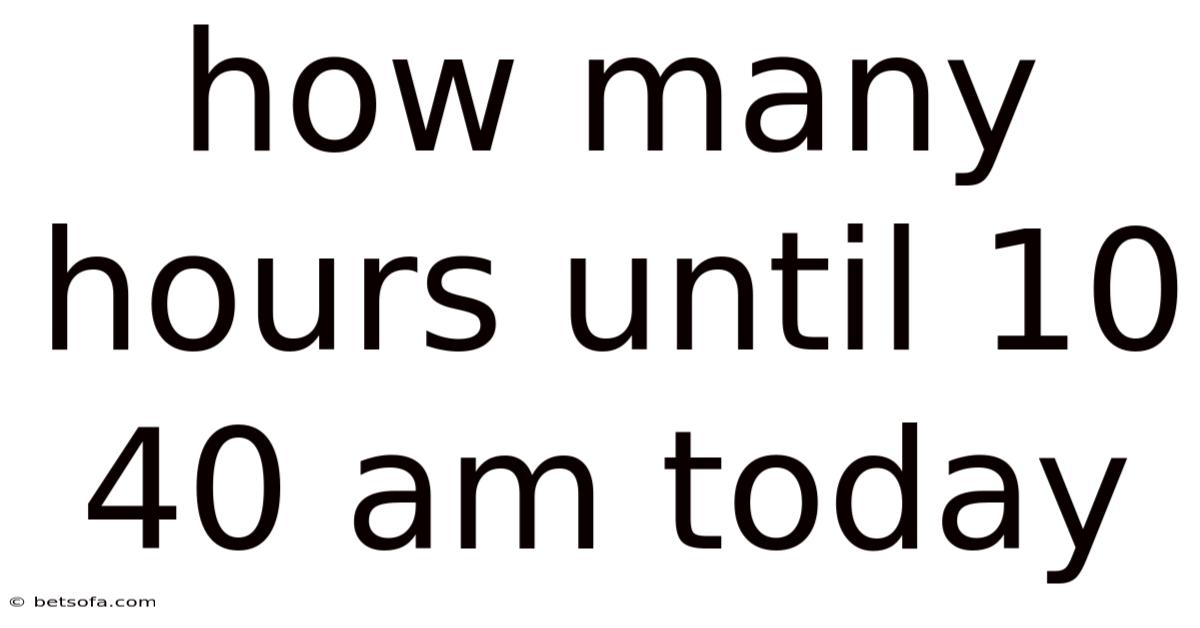 Calculating how many hours until 10:40 AM today is a simple yet essential skill for effective time management. By understanding the steps involved and considering factors like time zones and the next day, you can accurately determine the time difference. Whether you're planning your day or coordinating with others, mastering time calculations can help you stay organized and punctual. Remember, time is a valuable resource—use it wisely!