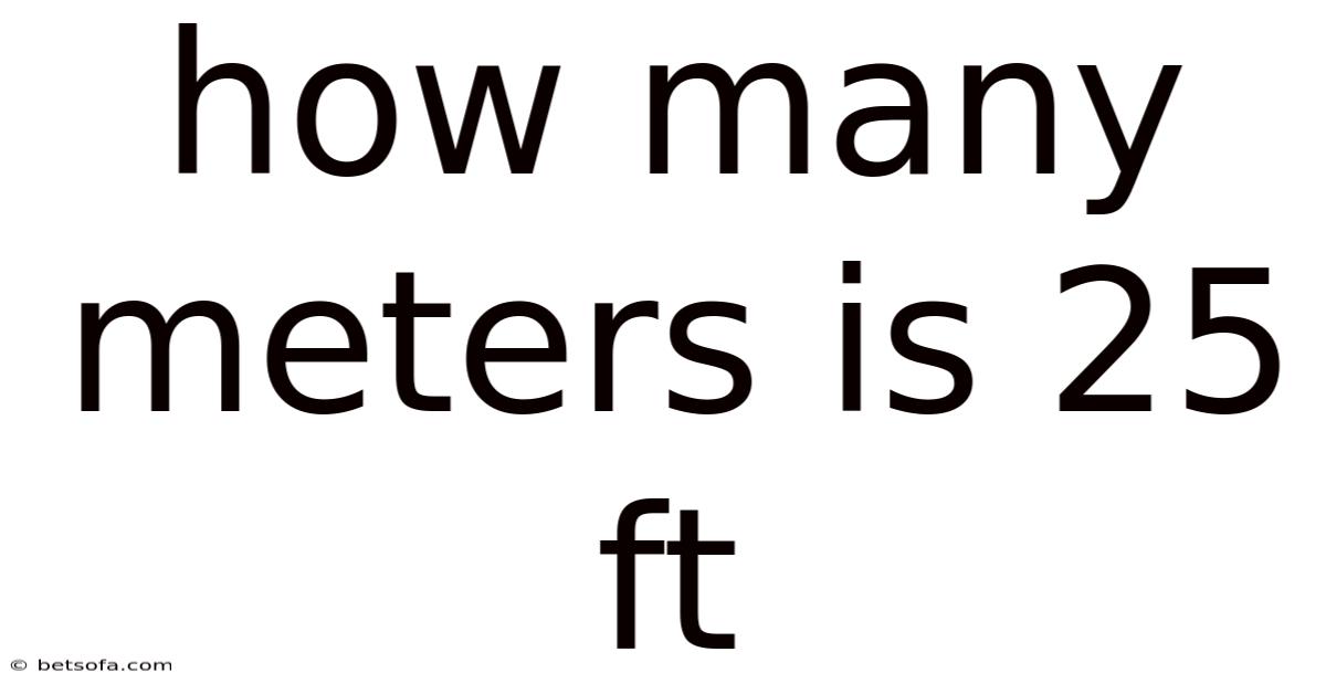 Q: How many meters is 25 ft? A: 25 feet is equal to 7.62 meters. This is calculated by multiplying 25 by the conversion factor of 0.3048 The details matter here..