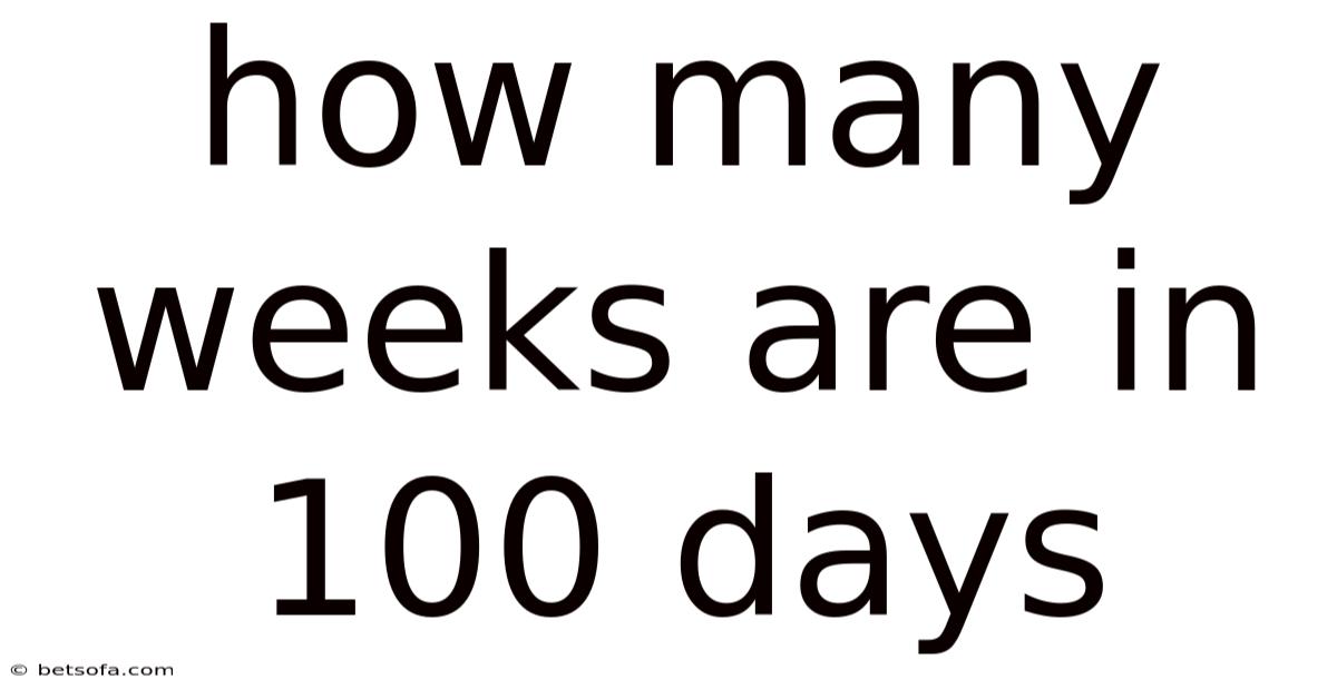 Understanding how many weeks are in 100 days is a simple yet powerful piece of temporal literacy. 29 weeks** when expressed as a decimal. Plus, by dividing 100 by the constant 7, we find that the period comprises 14 full weeks and 2 extra days, or roughly **14. This conversion matters across diverse scenarios—from fitness challenges and academic semesters to project timelines and scientific analyses Most people skip this — try not to..