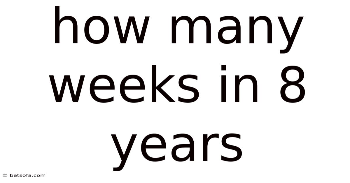Q: How many weeks are exactly in 8 years? A: Typically, 8 years contain 416 weeks and 2 extra days, which is approximately 416.29 weeks.
