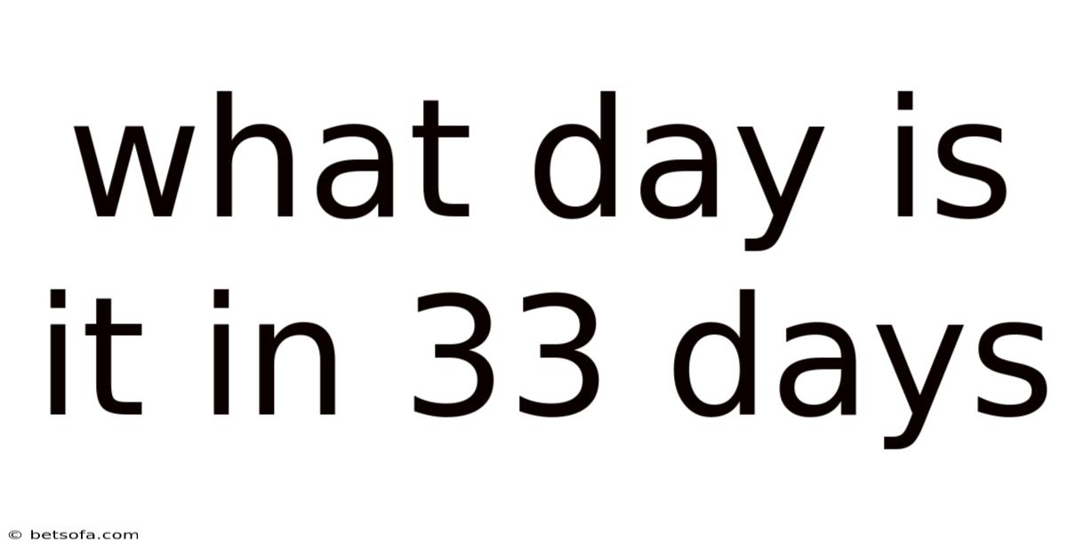 A: To calculate what day it will be in 33 days, divide 33 by 7 and note the remainder. Starting from today's day of the week, count forward by the remainder to find the day of the week in 33 days Nothing fancy..