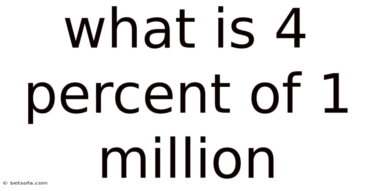 The core keyword for this discussion is percentage, specifically the process of determining a fractional amount of a large base number. Day to day, this calculation yields a result of 40,000, but the true value lies in the methodology and the context in which such a figure is used. That said, 4 percent of 1 million is mathematically expressed as 4% × 1,000,000, which translates to finding 4 out of every 100 units within a group of one million units. Whether you are an investor evaluating a return, a student learning foundational math, or a professional interpreting a report, mastering this concept provides a solid foundation for more complex numerical reasoning Not complicated — just consistent..