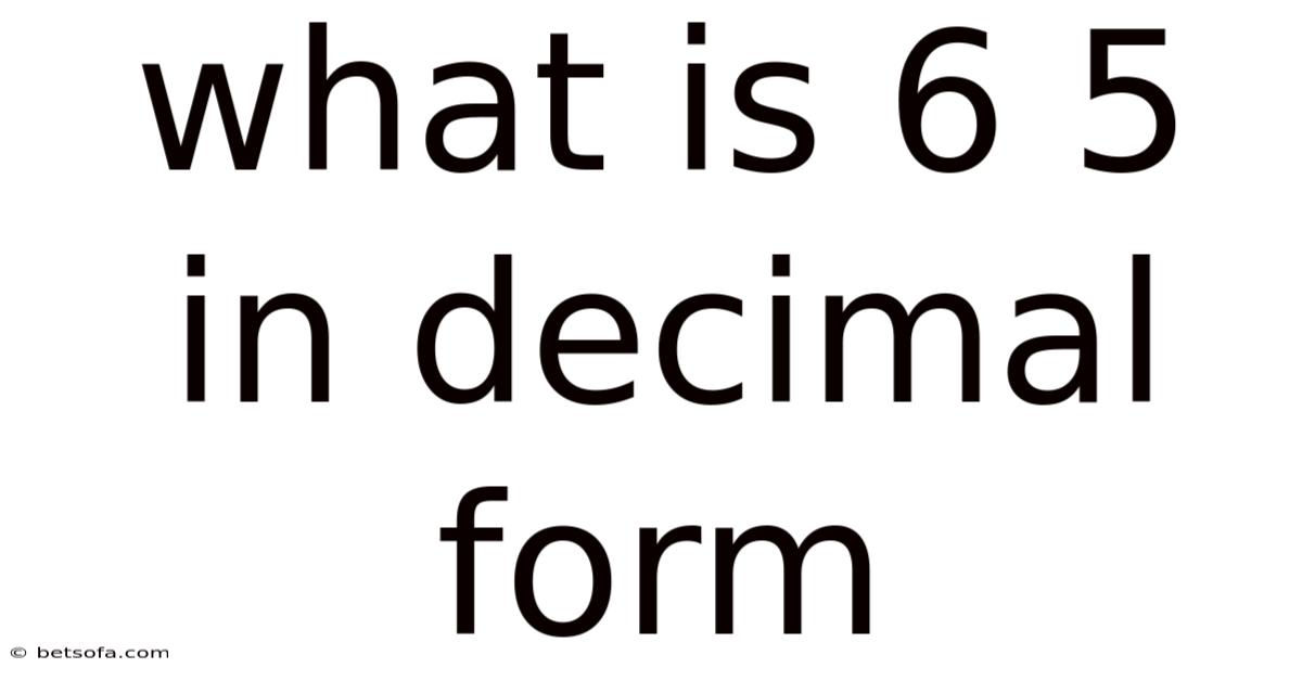 Q: What is 6/5 in decimal form? A: 6/5 in decimal form is 1.2. This is obtained by dividing 6 by 5.