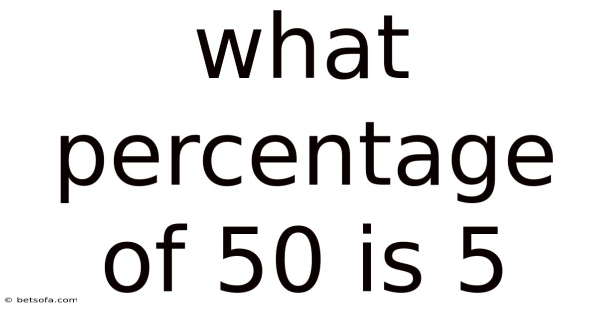 Q: What percentage of 50 is 5? A: 5 is 10% of 50. This is calculated by dividing 5 by 50 and multiplying by 100.