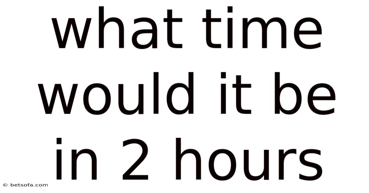 In our fast-paced, scheduled lives, the simple question "What time would it be in 2 hours?" is a fundamental calculation we perform almost instinctively. Whether you're planning a meeting, cooking a meal, catching a train, or just wondering when your favorite show starts, the ability to quickly determine a future time is an essential, everyday skill. Here's the thing — at its core, this query asks us to perform temporal arithmetic—adding a duration (two hours) to a specific starting point (the current time). While it seems trivial, mastering this concept involves understanding the cyclical nature of our timekeeping systems, the distinction between 12-hour and 24-hour formats, and the practical implications of crossing over midnight. This article will transform this basic query into a comprehensive exploration of time calculation, ensuring you can answer it accurately and confidently in any situation Small thing, real impact. Nothing fancy..