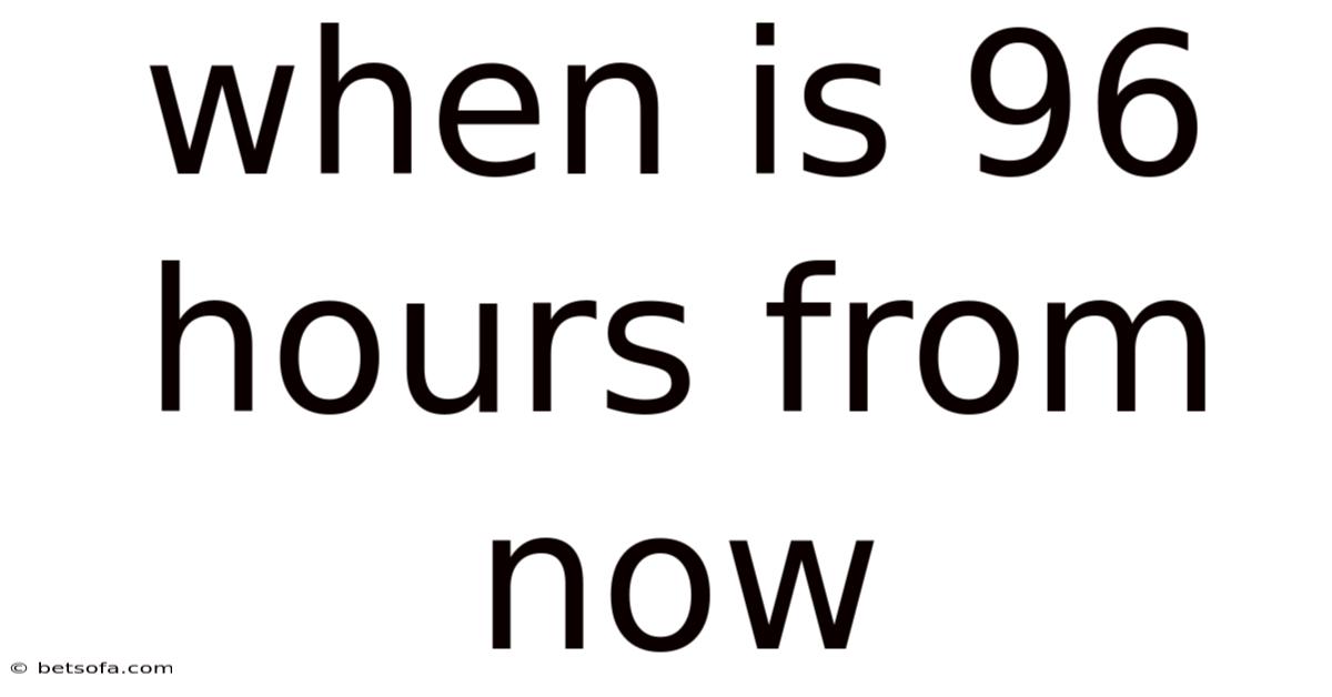 The concept of "96 hours from now" is straightforward: it refers to a period of 96 hours (or four full days) added to the current time. So, if it is currently Monday at 3:00 PM, adding 96 hours would bring us to Friday at 3:00 PM. Since one day consists of 24 hours, multiplying 24 by 4 gives us 96 hours. This kind of calculation is often used in contexts where a specific deadline or event is set exactly four days ahead.